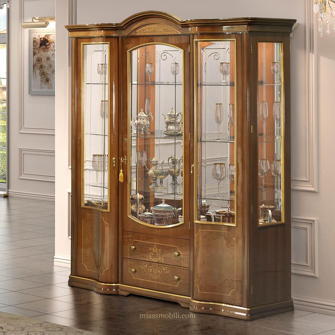 Карнизы и цоколи витрины отделаны золотом. Выдвижные ящики оборудованы системой доводки. Задние стенки зеркальные.В верхней части витрины установлена подсветка.